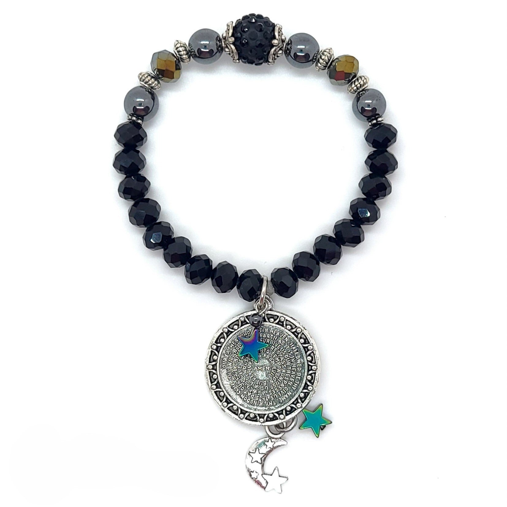 This beautiful bracelet is made with genuine black hematite and faceted crystals, stainless steel, enamel-coated metal elements, the Our Father prayer medal, and multicolored hematite charms. Good night!