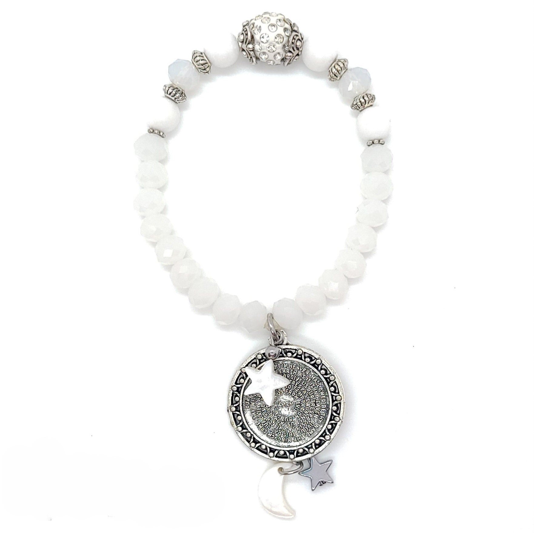 This beautiful bracelet is made with genuine mother of pearl and faceted crystals, featuring the Our Father prayer medal and charms in hematite and shell. Good night!