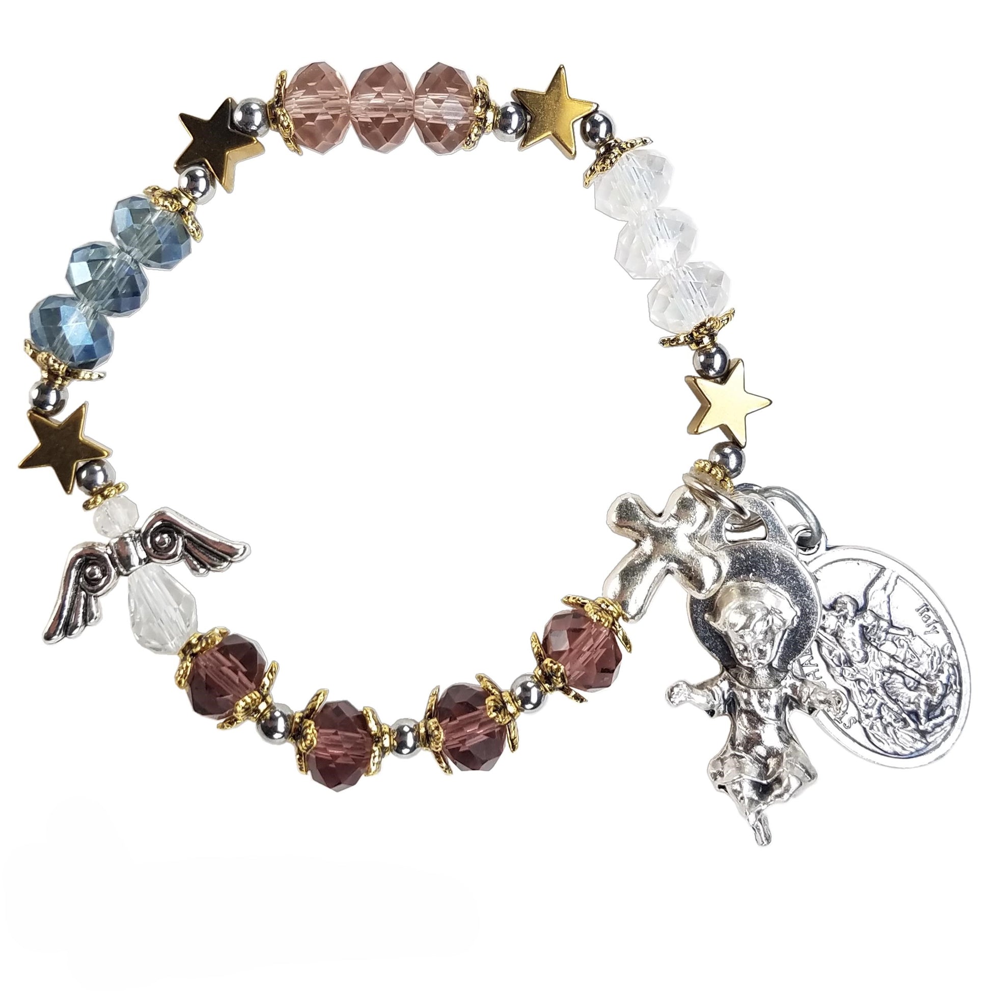 This bracelet contains the St. Michael the Archangel chaplet in the 4 special liturgical colors of the year, featuring an original Italian double medal of Saint Michael the Archangel with the Guardian Angel on the reverse side, and an original Italian charm of baby Jesus. Crafted with hematite, faceted crystals, and enamel-coated metals.
