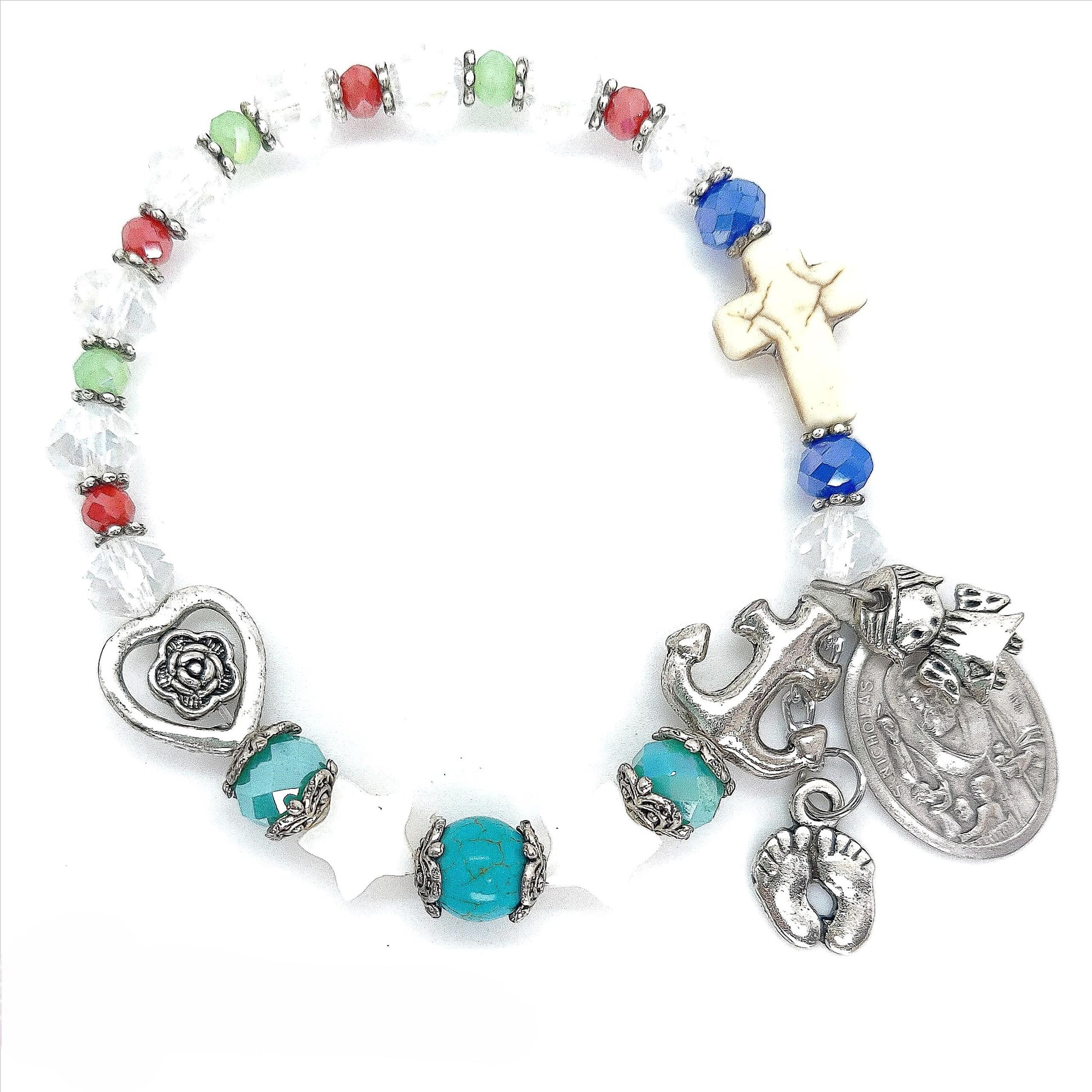 Saint Nicholas is the patron saint of children and the origin of the Santa Claus story. Learn his touching story with this historic rosary bracelet made of faceted crystals, jasper quartz, mother-of-pearl, and dyed howlites. Enameled metals and authentic Italian medal of Saint Nicholas of Bari - the True Santa Claus. Each element of this bracelet alludes to the symbolism and important events in the life of the "Worker of Miracles".
