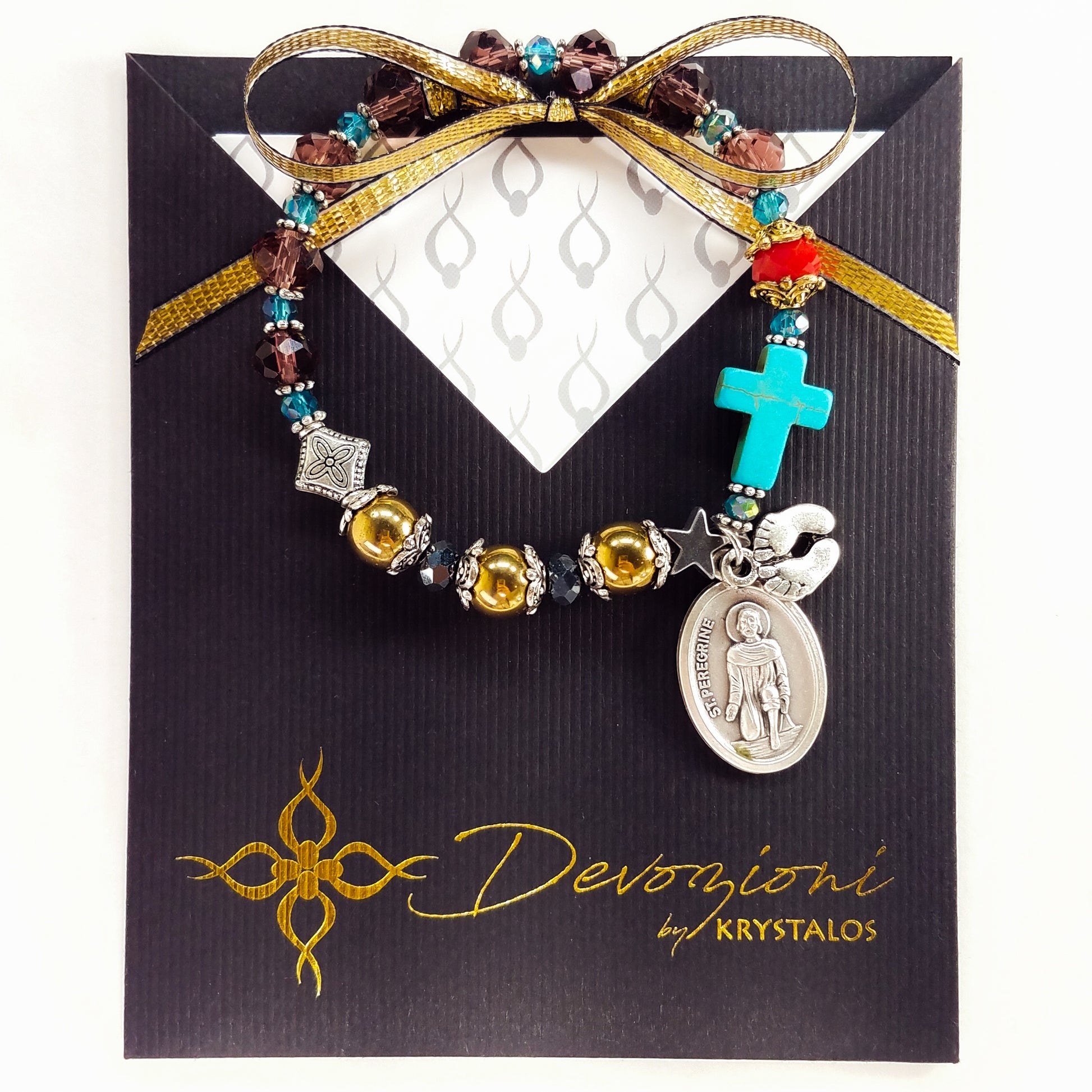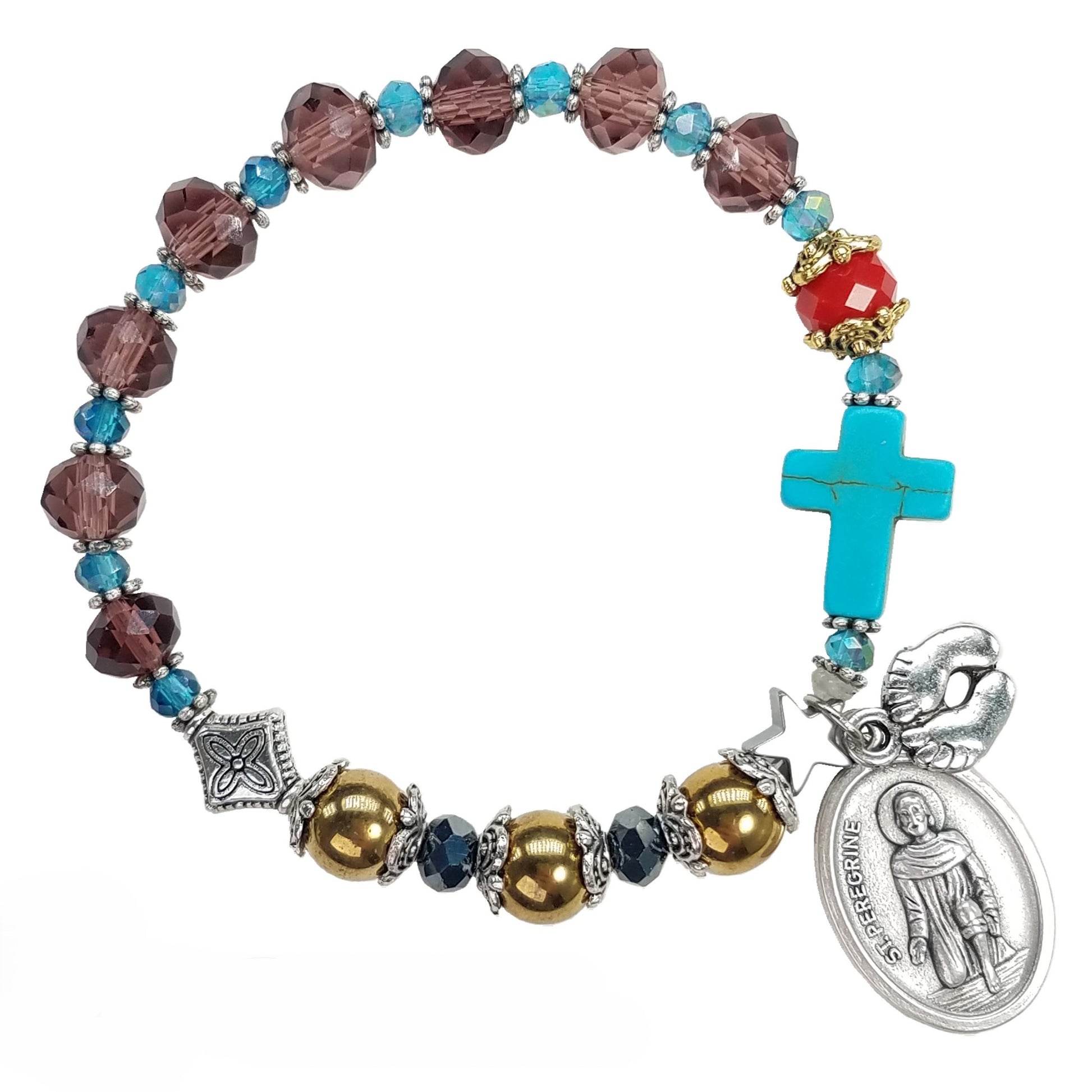 Rosary bracelet featuring faceted crystals and genuine semi-precious stones such as hematites and dyed howlite. Accented with enameled metals and an original Italian medal of Saint Peregrine. Each element of this bracelet alludes to symbolism and significant events in the life of Saint Peregrine